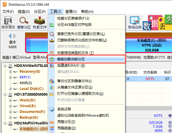 第一步:打开DiskGenius软件,选中丢失数据的RAW分区,然后在软件里面依次点击"工具" – "智能加载当前分区"菜单项。这个功能对于损坏不是非常严重的NTFS分区非常有效。加载完成后,如果可以看到丢失的数据,直接复制到其他盘即可。不过,如果文件系统部分损坏的非常严重,将不会有预期的效果。这时候,也无须慌张,请进行第二步,使用"恢复文件"功能搜索丢失的文件 。