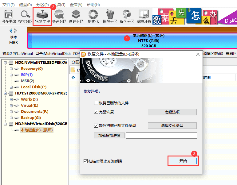第二步:选中RAW分区后,点击"恢复文件"按钮,然后点击"开始"。之后,软件将对整个分区进行深度扫描,查找丢失的数据。