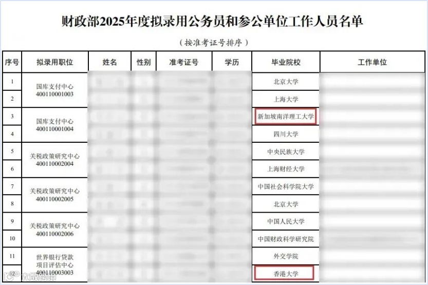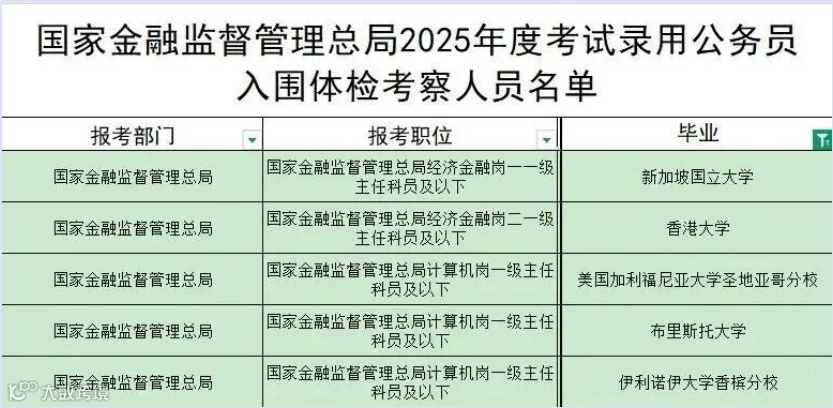 - 金融监管局录用名单包含来自香港大学、新加坡国立大学等国际知名院校的毕业生;