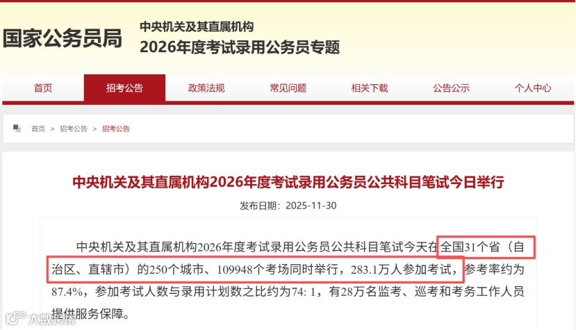 2025年12月,2026年度国家公务员考试笔试结束。本次考试报名人数达283.1万,参考率约87.4%,平均每74名考生竞争一个岗位,报考比例创近十年新高,部分热门职位出现“六千抢一”的激烈局面。
