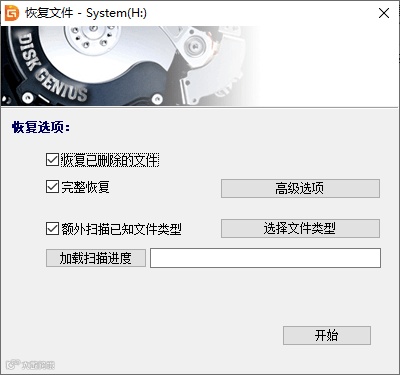 在弹出的恢复文件窗口上,点击"开始"按钮,让软件开始搜索丢失的照片。