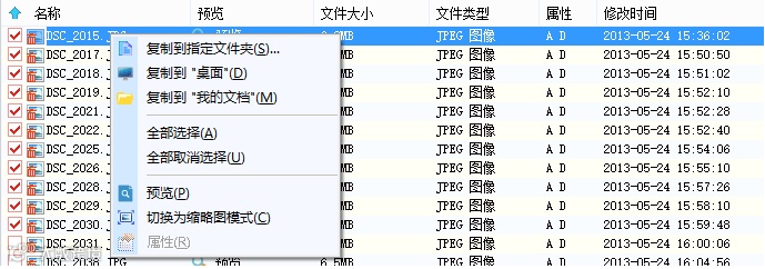 第三步:扫描结束后,在列出的文件中找到需要恢复的照片,勾选需要恢复的照片,然后点击鼠标右键,将照片复制到电脑或是其他存储设备上,完成照片恢复。