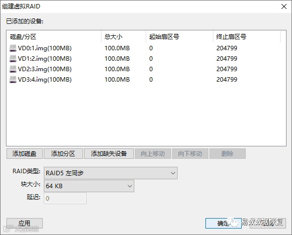 步骤二:当"组建虚拟RAID"对话框弹出后,可以点击"添加磁盘"来添加硬盘,并设置硬盘顺序、RAID类型、块大小、延迟参数等。最后点击"确定"按钮。