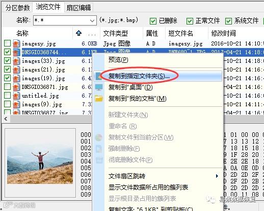 DiskGenius完成扫描后,可以对列出的文件进行预览,从而可以准确找到想要恢复的照片文件。勾选文件并右击鼠标,然后选择 “复制到指定文件夹” 选择。