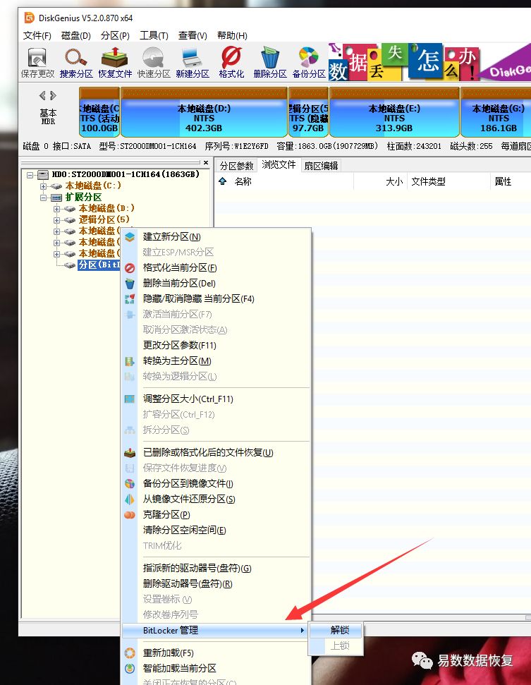 DiskGenius可以通过密码、密钥或BEK文件,解锁加密分区。