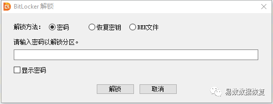 接下来,DiskGenius会弹出BitLocker解锁界面,用户可以提供密码、密钥或BEK文件,解锁BitLocker分区,如下图:
