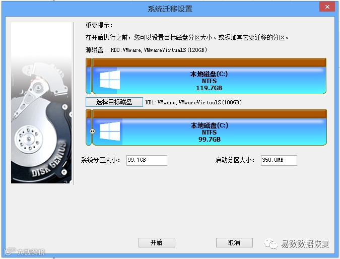 提示:DiskGenius会对迁移系统的目标硬盘,做重新分区的操作,这意味着,如果该目标硬盘中有数据,这些数据都将丢失。因此需要先备份目标盘中的重要数据。