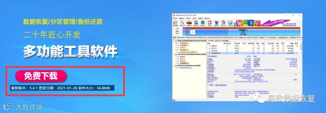 磁盘管理软件涉及数据安全,请始终使用最新版本。不要将软件下载安装到要恢复数据的分区!