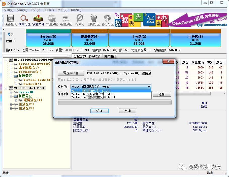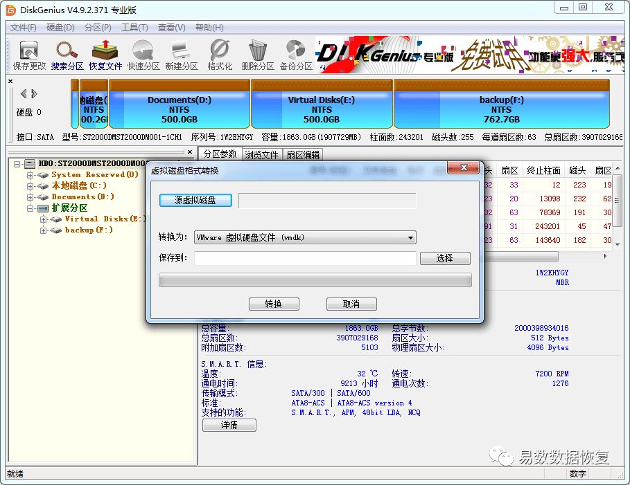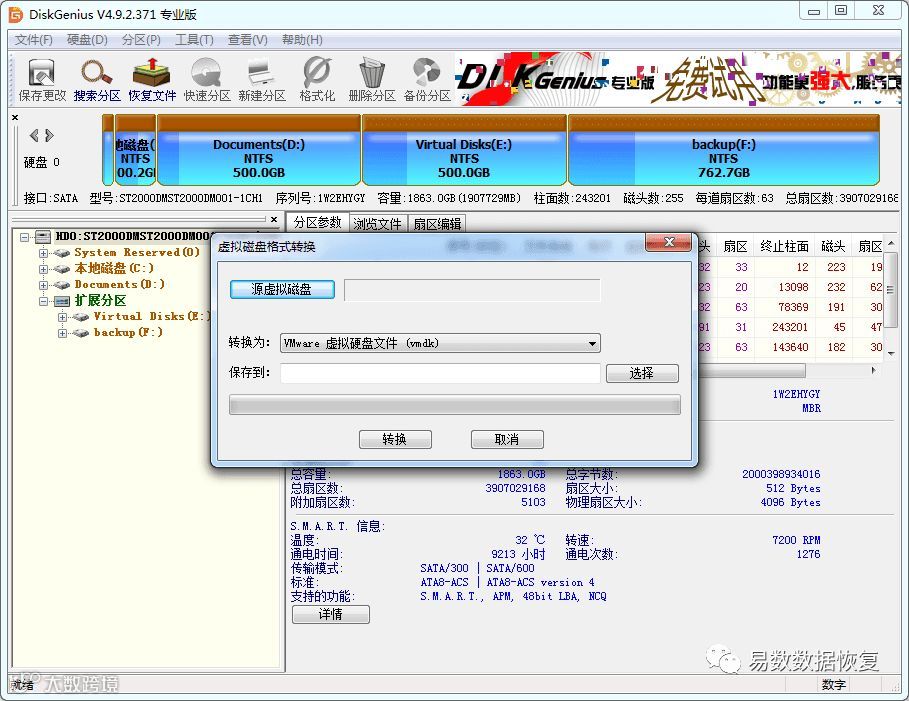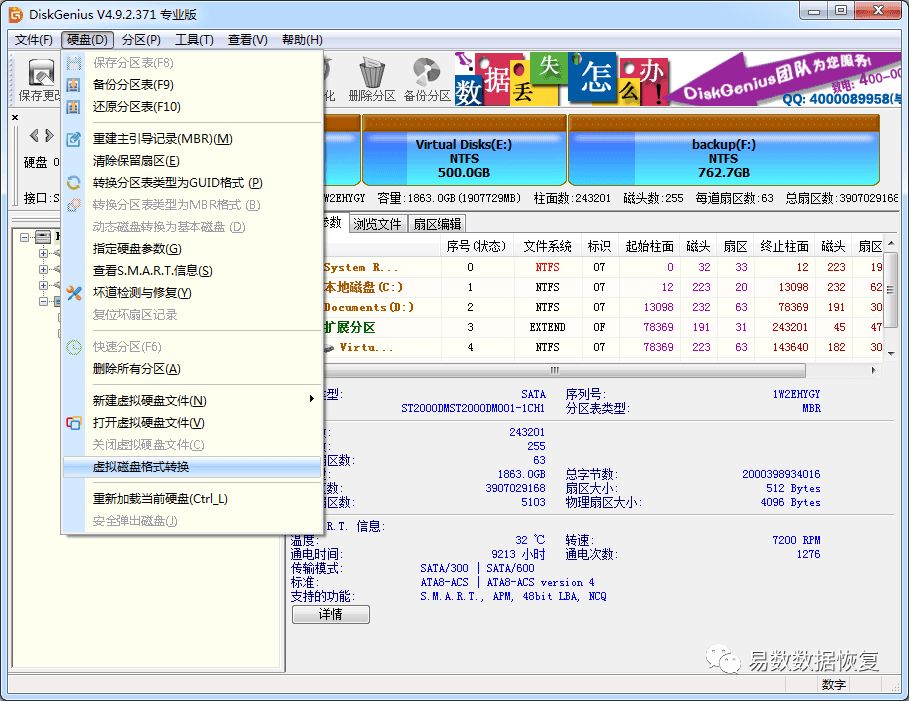 运行DiskGenius软件,点击“硬盘”菜单并选择“虚拟磁盘格式转换”选项。