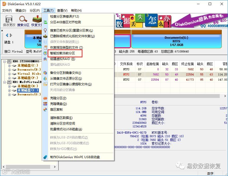软件打开后,可以很快找到需要恢复数据的分区。在软件里可以查看下分区里的数据是否直接被列出来了。此外,对于打不开的NTFS分区,还可以尝试 智能加载当前分区 这个功能。有些情况,无须进行扫描就可以直接看到丢失的数据。如果看不到数据,则说明分区损坏的比较严重了,需要进行下面的步骤。