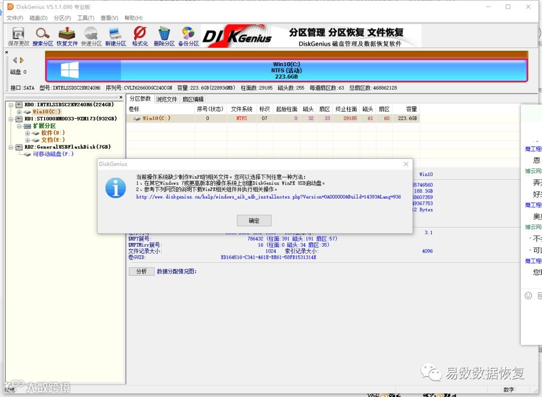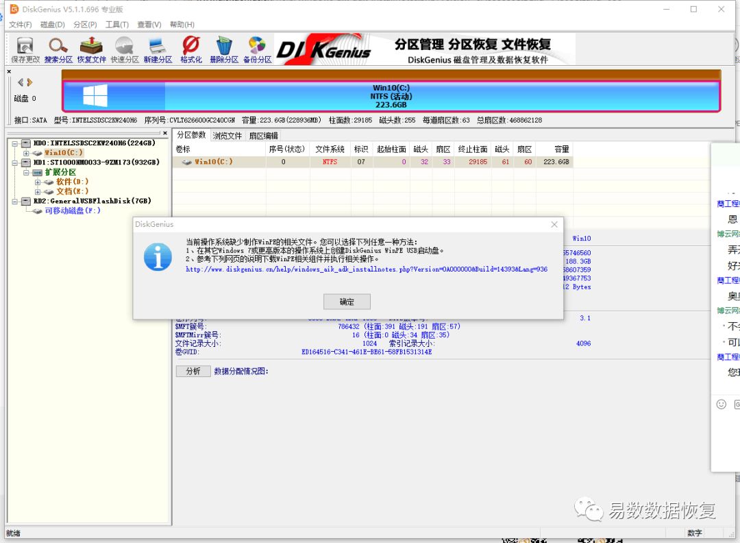 打开DiskGenius软件点击“文件”-“重新启动系统并运行WinPE版DiskGenius软件”,如有以下提示,说明您电脑中缺少相关组件。