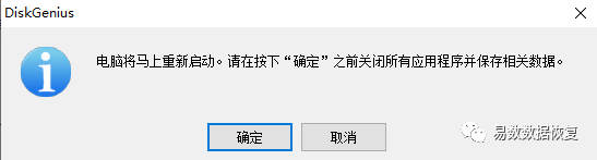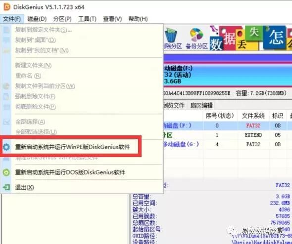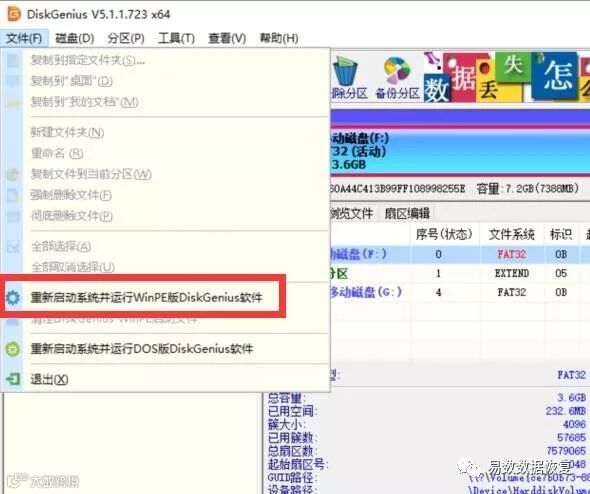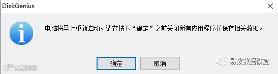 安装完成之后点击软件中的“文件”-“重新启动系统并运行WinPE版DiskGenius软件”如下图 ,点击确定之后,软件会提示正在“创建WinPE环境”等待创建完成电脑会自动重启进入WinPE版DiskGenius软件界面。
