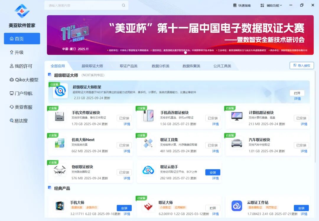 美亚软件管家是一款支持用户下载、安装、升级的一站式取证产品管理工具,提供最新、最全的取证软件,大大节省寻找和下载资源的时间,畅享取证乐趣。