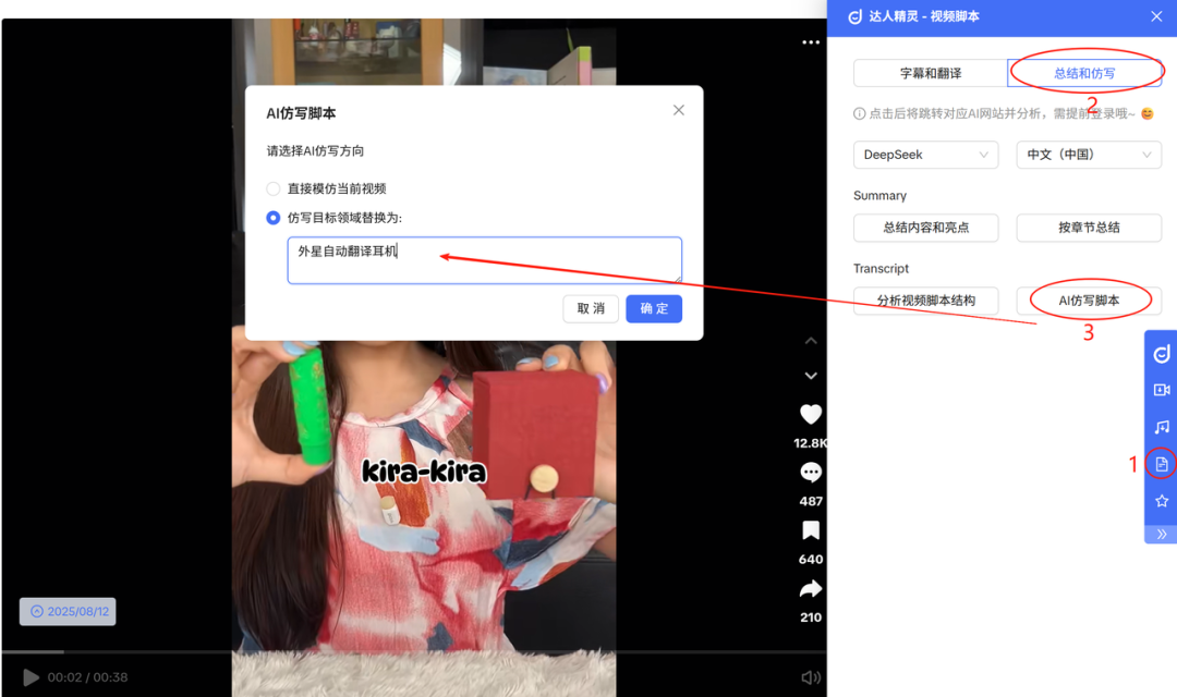 一键仿脚本 输入你的产品,直接套用爆款结构生成新脚本,根本不用抠脑壳想文案。