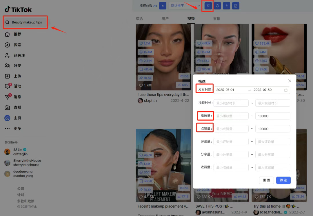 精准筛选爆款 在推荐页搜品类关键词,比如“美妆教程”,装上插件后,你可以按播放量/点赞量等维度,精准筛选垂直领域热门内容,快速找到对标爆款,避免盲目模仿;