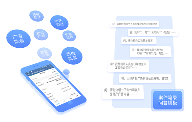 系统针对违法事实清楚、证据确凿,且情节简单、处罚轻微的常见违法事项预设100+常见案件笔录问答模板。现场调查阶段可通过预设模板快速生成笔录,解决问话要点错漏、重复等问题,节省工作量又保障笔录证据内容完整规范。