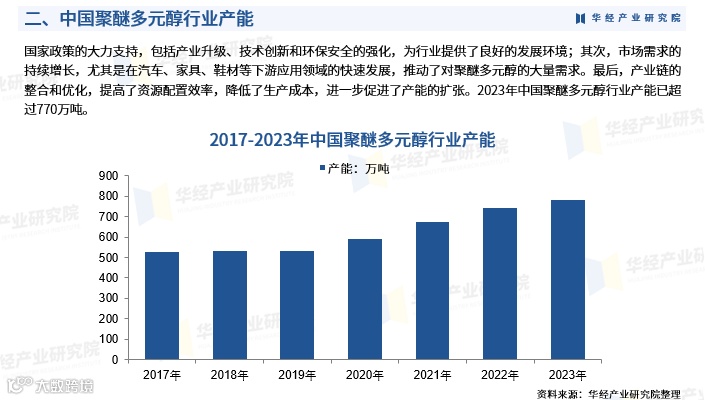 在国家产业升级、技术创新和环保安全政策的支持下,聚醚多元醇行业迎来良好发展环境。汽车、家具、鞋材等下游领域需求快速增长,带动对聚醚多元醇的大规模应用。产业链整合优化提升了资源配置效率,降低生产成本,促进行业产能扩张。2023年,中国聚醚多元醇行业产能已突破770万吨。