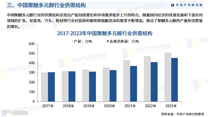随着国内经济复苏及家具、汽车、鞋材等行业对软质与硬质聚氨酯泡沫需求上升,聚醚多元醇的产量与消费量持续增长,呈现出供需双旺态势。