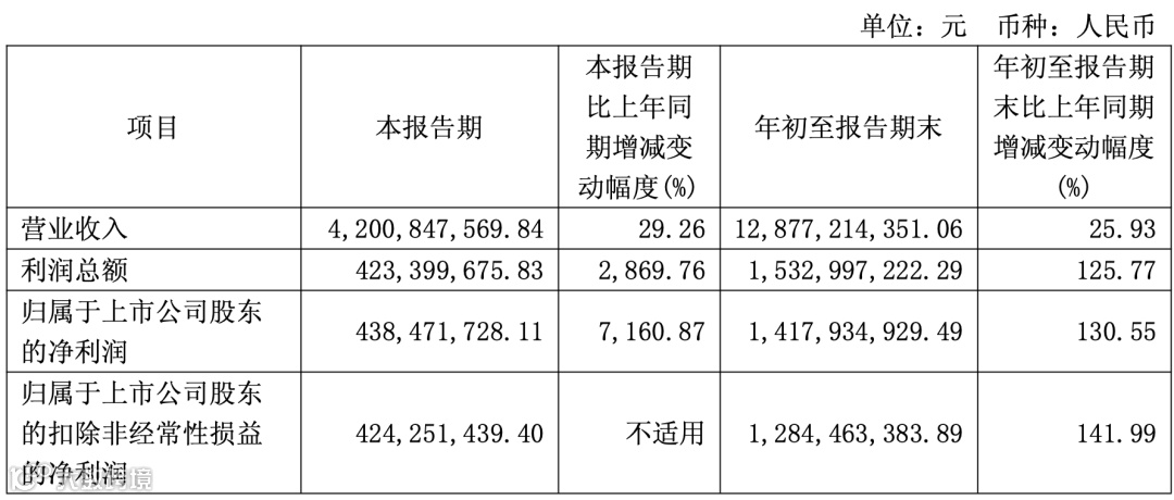 单季度归母净利润暴涨7160.9%至4.38亿元,前三季度营收128.77亿元、归母净利润14.18亿元,同比分别增长25.93%、130.55%。