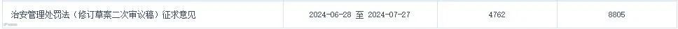 《治安管理处罚法(修订草案二审稿)》于会议闭幕当天(2024年6月28日)在中国人大网全文公布向社会公众征求意见。2024年7月27日征求意见截止,参与人数4762人,意见条数8805条。