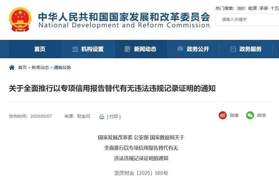 国家发改委网站5月7日消息,国家发展改革委、公安部、国家数据局发布关于全面推行以专项信用报告替代有无违法违规记录证明的通知:
