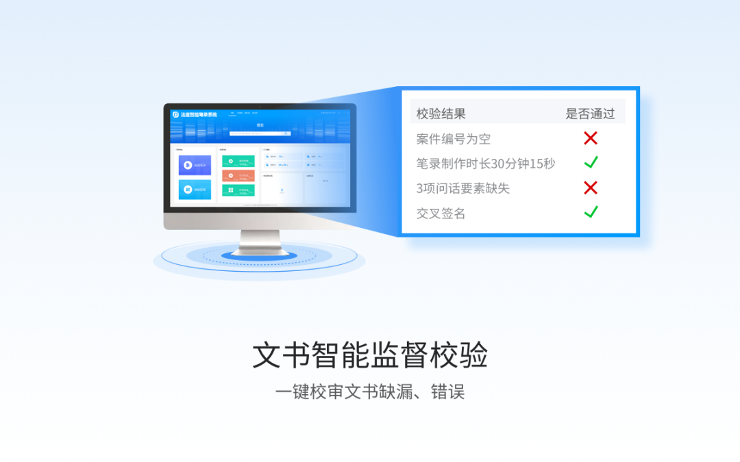 内嵌文书监督校验功能,可针对笔录文书中的问话要素是否完整、笔录时长是否符合要求、是否存在交叉签名等情况进行智能检测校验,校验结果实时反馈,从而保障笔录文书质量。