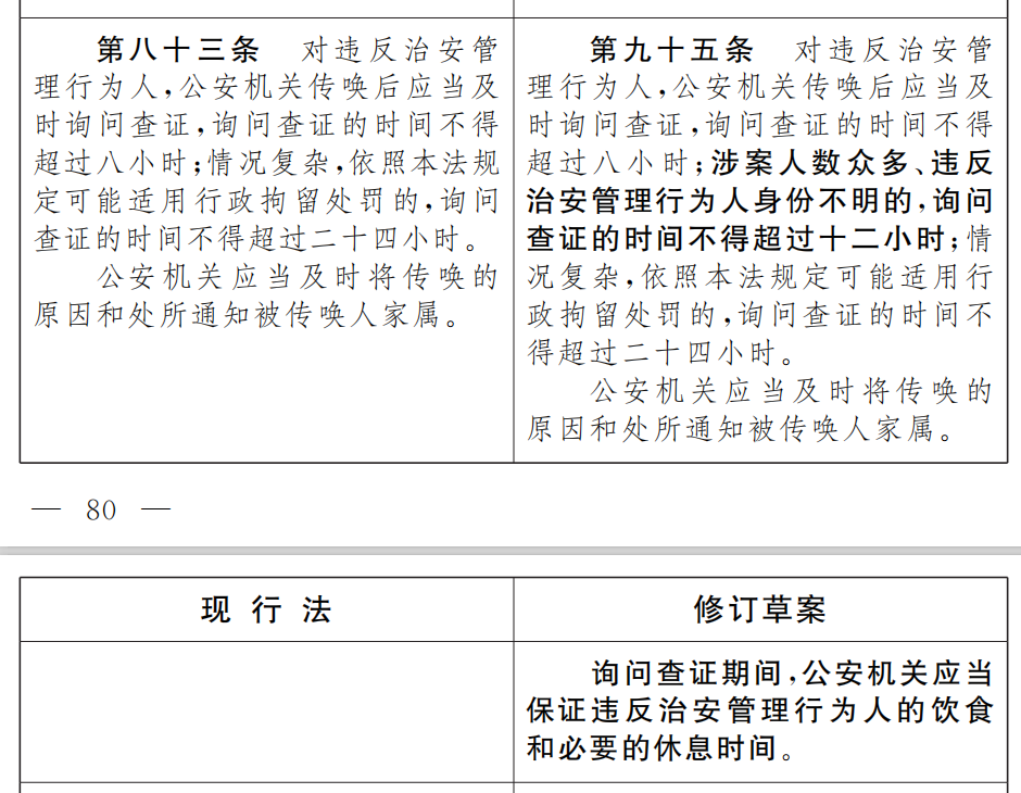 在现行8小时、24小时询问查证时限之间,增加了12小时的时限,并明确在涉案人数众多、违反治安管理行为人身份不明情形下可以适用,便于基层操作,用足用好法定查证时限。另外,为了更有效地保障人权,防范变相刑讯逼供,本条吸纳了《公安机关办理行政案件程序规定》关于保障嫌疑人饮食休息的相关规定。