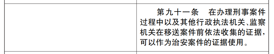 第九十一条 在办理刑事案件过程中以及其他行政执法机关、监察机关在移送案件前依法收集的证据,可以作为治安案件的证据使用。