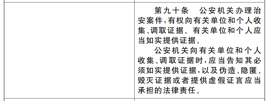 第九十条 公安机关办理治安案件,有权向有关单位和个人收集、调取证据。有关单位和个人应当如实提供证据。