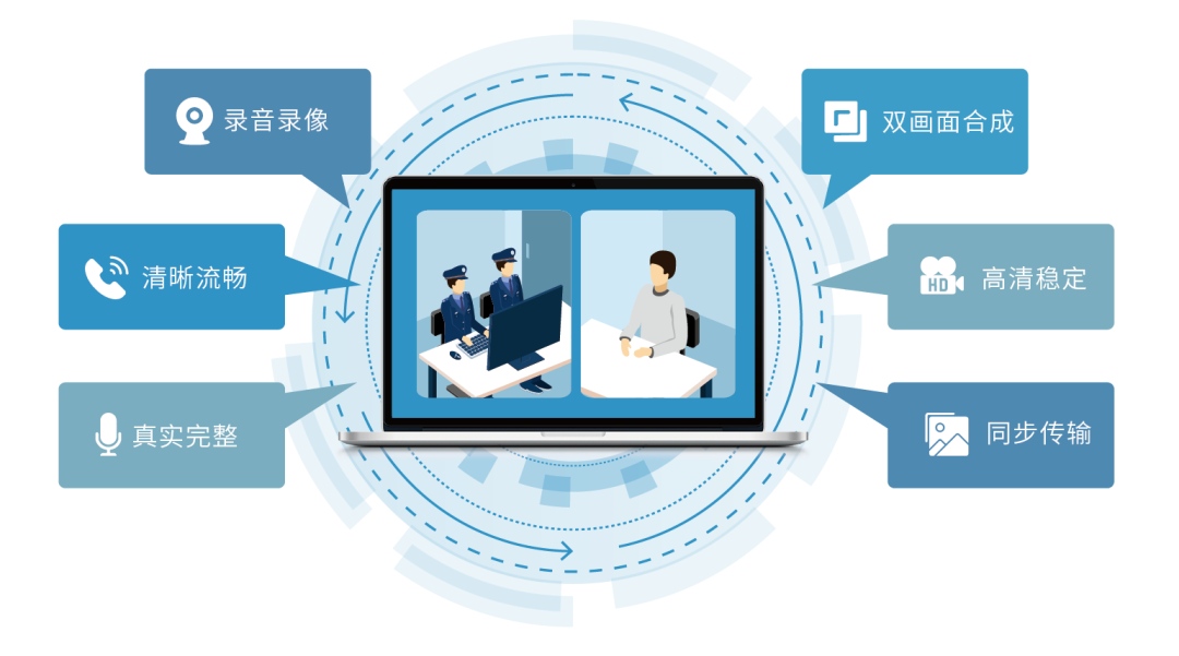 法度远程提讯系统,以远程视频通讯等数字技术为支撑,在安全可靠和满足法律效力要求的前提下,通过远程可视对话、远程示证、文书签字、笔录制作、全过程同步录音录像、视频刻录存证等功能,实现公安派出所(办案区)与看守所(监所)之间的远程视频提讯(提审)。