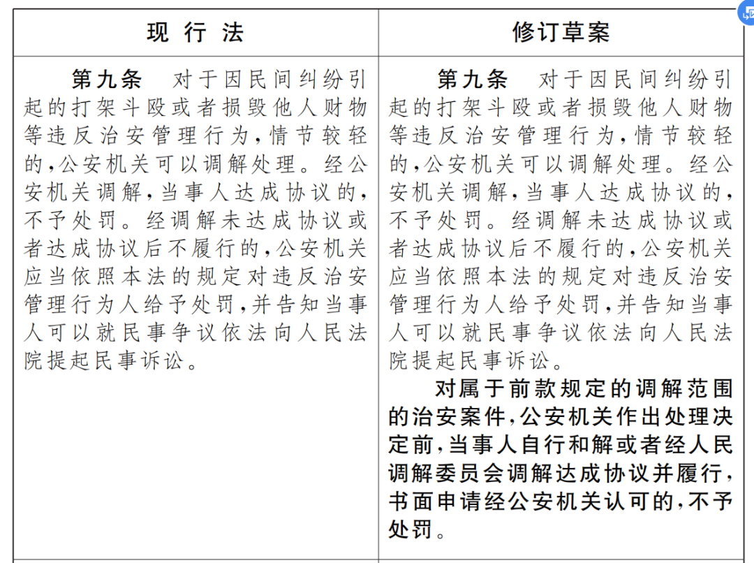 目前,《治安管理处罚法(修订草案)》正在向社会公开征求意见,经对修订草案进行研究学习,涉及治安调解变化有两处。