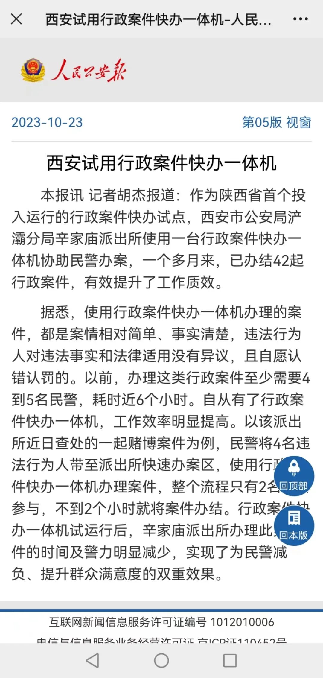 本报讯 记者胡杰报道:作为陕西省首个投入运行的行政案件快办试点,西安市公安局浐灞分局辛家庙派出所使用一台行政案件快办一体机协助民警办案,一个多月来,已办结42起行政案件,有效提升了工作质效。