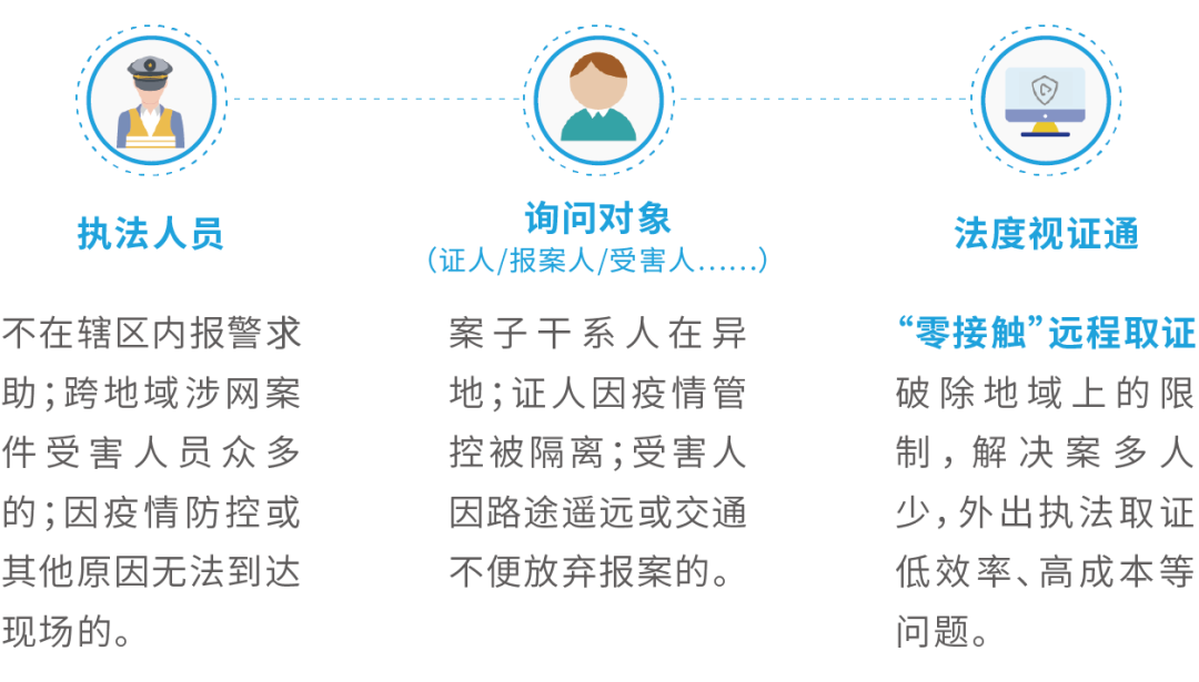 法度视证通远程视频询问系统,基于解决基层案多人少,执法人员外出取证低效率、高成本以及疫情防控期间取证困难等诸多问题,运用“互联网+”科技技术,合规、合法地实现执法人员与询问对象之间跨区域“零接触”远程询问取证。