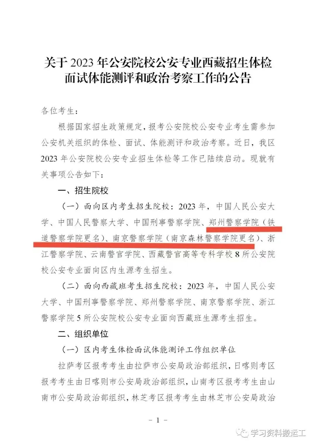 西藏自治区公安厅官网微信公众号“平安西藏”5月22日发布了一则《关于2023年公安院校公安专业西藏招生体检面试体能测评和政治考察工作的公告》。公告提到的招生院校当中明确提到了郑州警察学院(铁道警察学院更名)、南京警察学院(南京森林警察学院更名)。