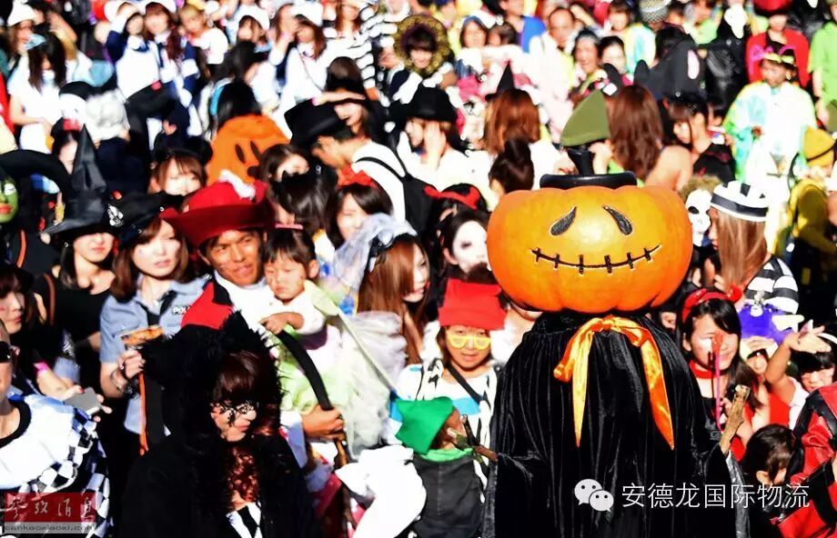 孩子们每年会穿上不一样的万圣节服装,拎着南瓜灯的提篓挨家挨户地讨糖,说是“不给糖就捣乱(trick or treak)”。
