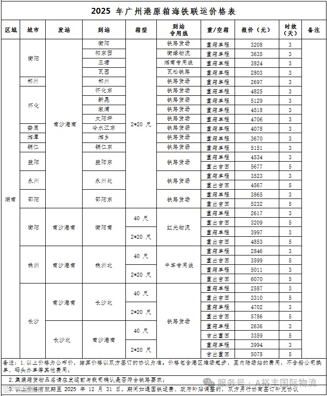 4、广州南沙港南站至湖南省各站点海铁联运价格表