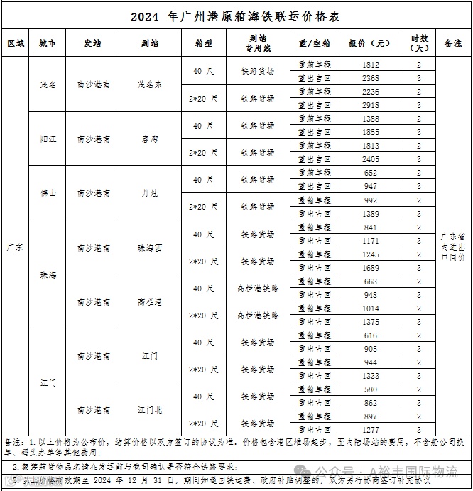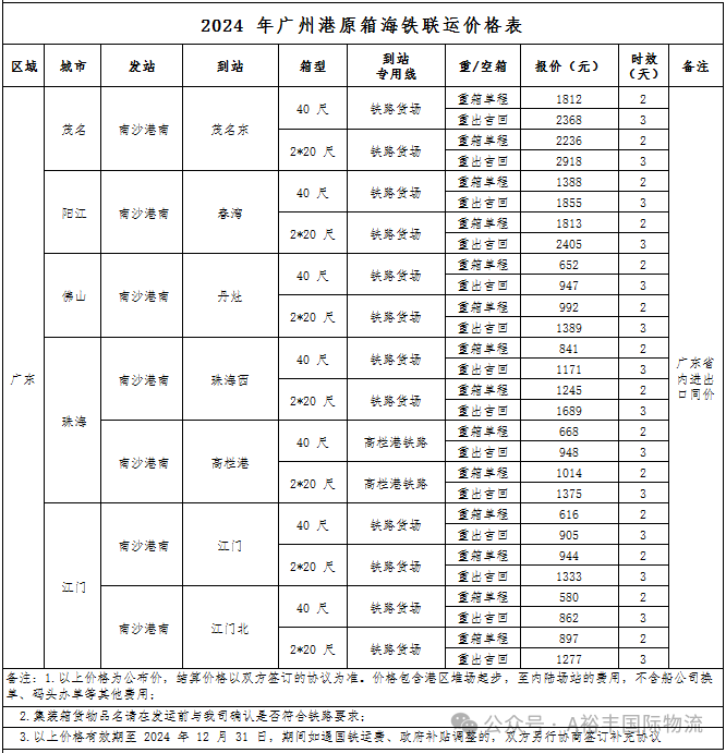 5、广州南沙港南站至广东省内各站点海铁联运价格表