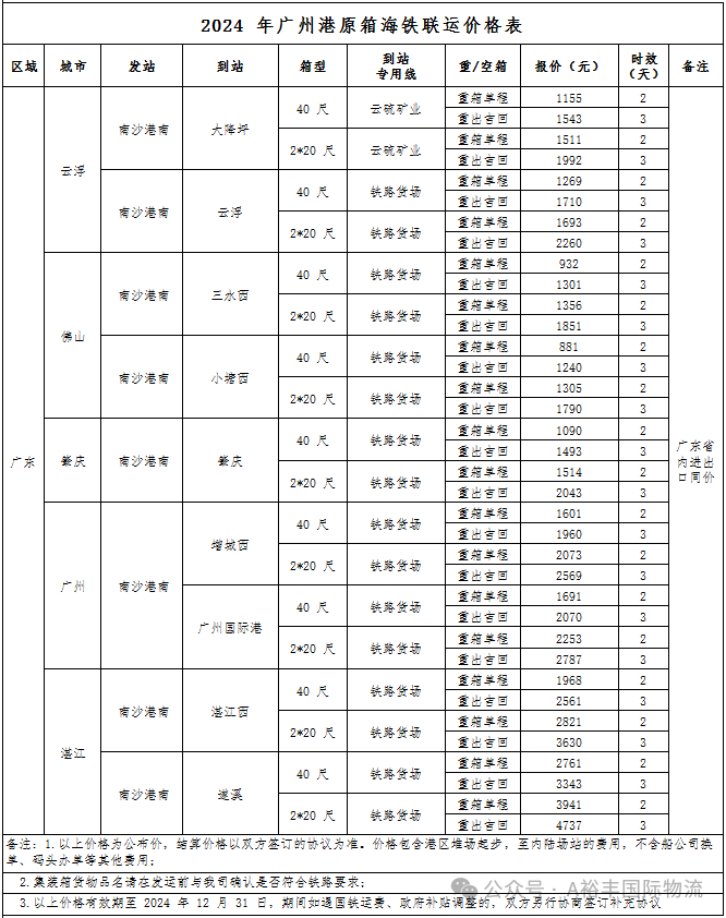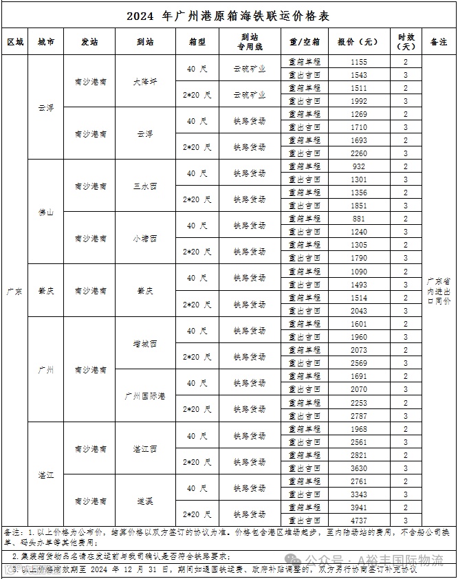 4、广州南沙港南站至广东省内各站点海铁联运价格表