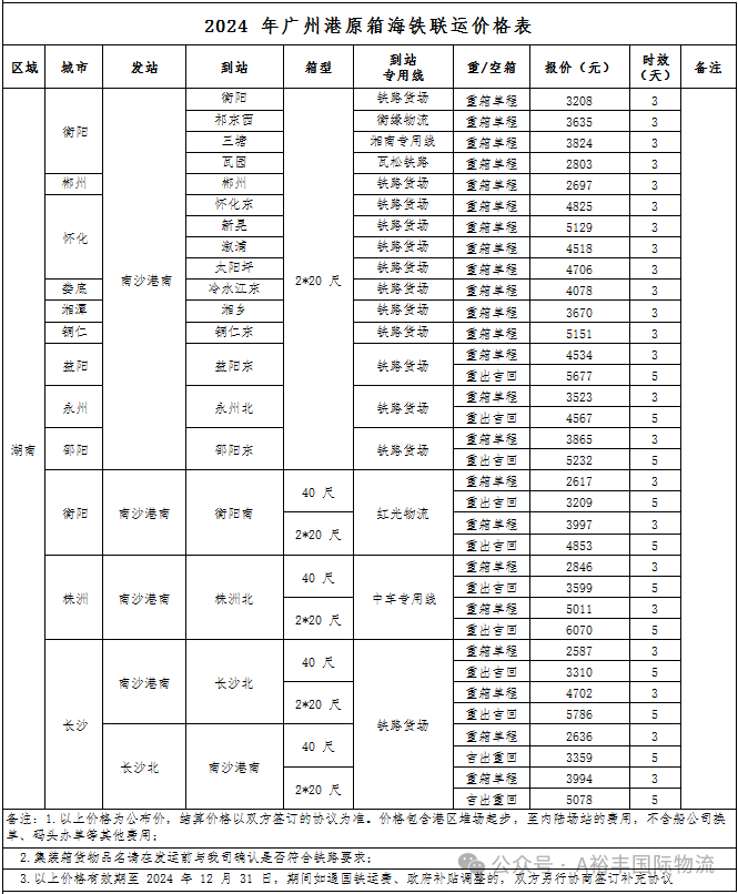 5、广州南沙港南站至湖南省各站点海铁联运价格表