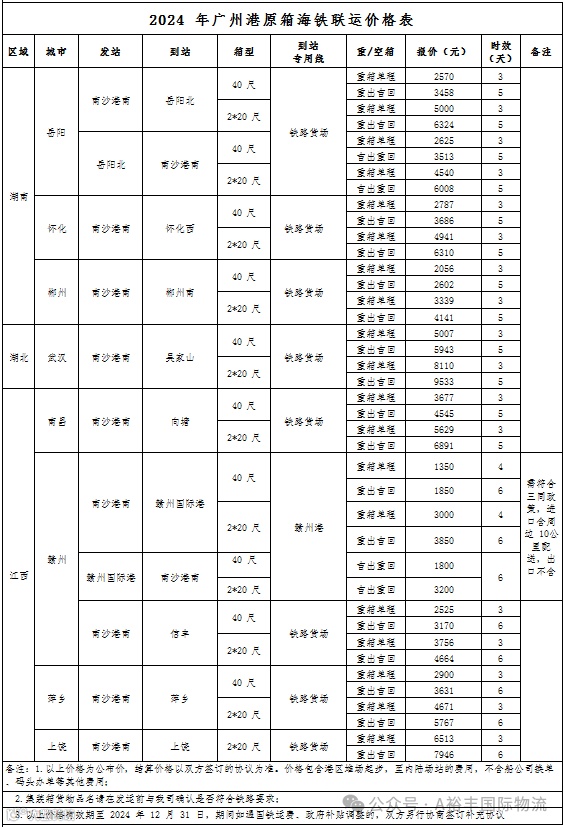 5、广州南沙港南站至湖南/湖北/江西省各站点海铁联运价格表