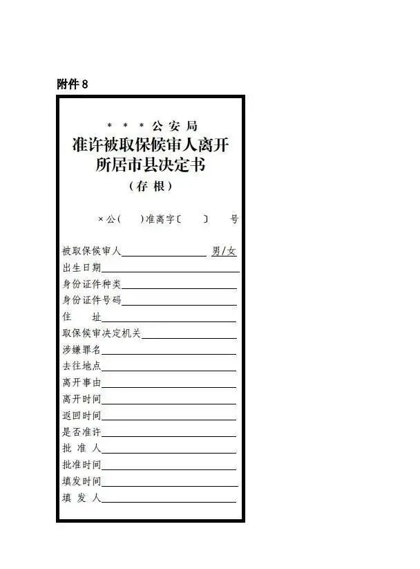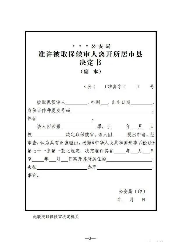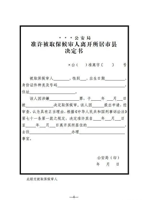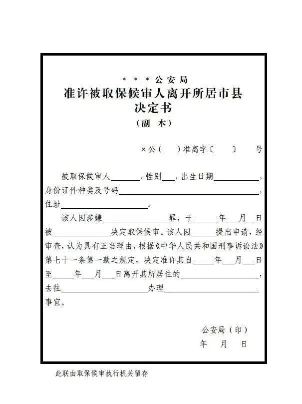 1.《准许被取保候审人离开所居市县决定书》
