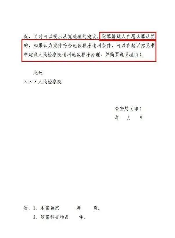 在《起诉意见书》中增加公安机关可以依法向检察机关建议适用速裁程序的内容;