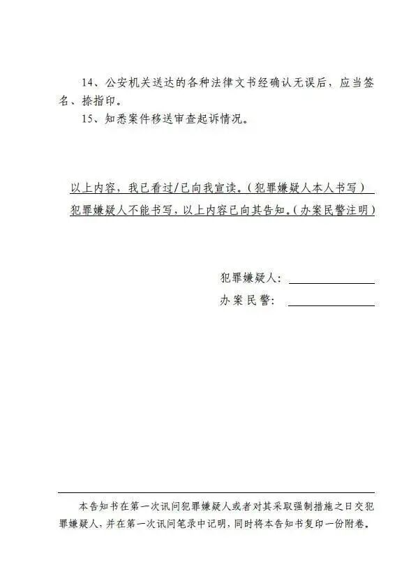 与此同时,犯罪嫌疑人/被害人/证人诉讼权利义务告知书的结尾处,对被告知人不能书写时,民警应注明的内容进行了统一规范,即:“犯罪嫌疑人/被害人/证人不能书写,以上内容已向其告知。(办案民警注明)”