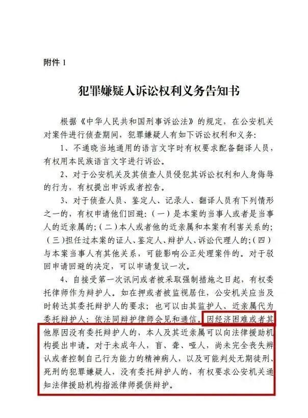 根据刑事诉讼法以及2019年最高人民法院、最高人民检察院、公安部、国家安全部、司法部《关于适用认罪认罚从宽制度的指导意见》要求,在《犯罪嫌疑人诉讼权利义务告知书》中增加了向犯罪嫌疑人告知认罪认罚从宽处理和依法申请法律援助、向值班律师寻求法律帮助等权利,进一步保障犯罪嫌疑人的合法权利。