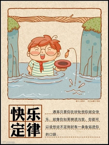 遇事只要你往好处想你就会快乐,就像你如果掉进沟里,你都可以设想说不定刚好有一条鱼钻进你的口袋。