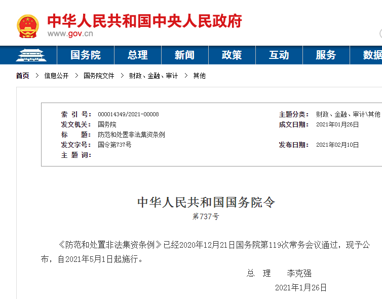 《防范和处置非法集资条例》已经2020年12月21日国务院第119次常务会议通过,现予公布,自2021年5月1日起施行。