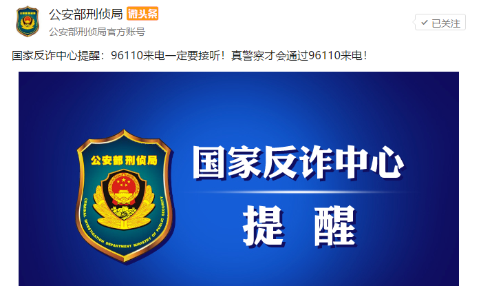 一是劝阻,接到“96110”这个号码打来的电话,说明市民或其家人正在遭遇电信网络诈骗,又或者属于易受骗高危人群。