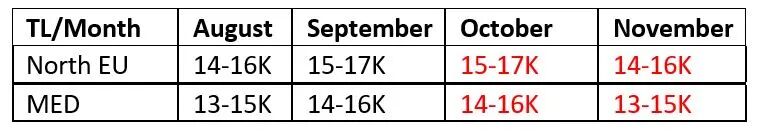 B. 10,052 China-European Liner trains operated in the first eight months 2021, carrying 1,934,000 TEUs, an increase of 32% and 40% respectively year-on-year. 1,323 departures of China-Europe freight trains were operated in August, exceeding 1,300 trains for the fourth consecutive month, carrying 128,000 TEUs, an increase of 9% and 16% respectively year-on-year. To date, the Central European line has laid out 73 lines of operation, reaching 174 cities in 23 European countries. (Source: www.chinanews.com)