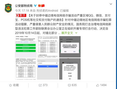 针对中缅边境地区电信网络诈骗犯罪活动猖獗、严重侵害人民群众财产安全的情况,国务院打击治理电信网络新型违法犯罪工作部际联席会议办公室正在组织开展专项打击行动,决定自2019年10月14日起,对缅北部分电信网络诈骗活动严重区域的QQ、微信、支付宝、POS机等社交和支付账户采取封停措施。如有疑问,请尽快联系公安部驻云南普洱工作站,公安机关将快速甄别,对因技术原因误关停的账号予以解封。