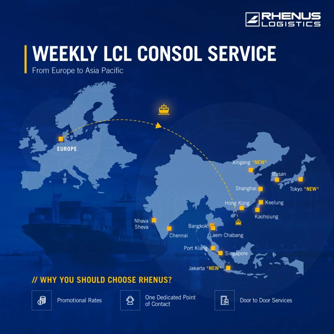 Rhenus offers weekly LCL departures from Europe to Asia Pacific. Cargo is consolidated in the Central European Gateway and sent directly to one of the 14 ports in Asia, including 3 new destinations: Jakarta, Tokyo, and Xingang. Promotional rates for all those destinations are available.